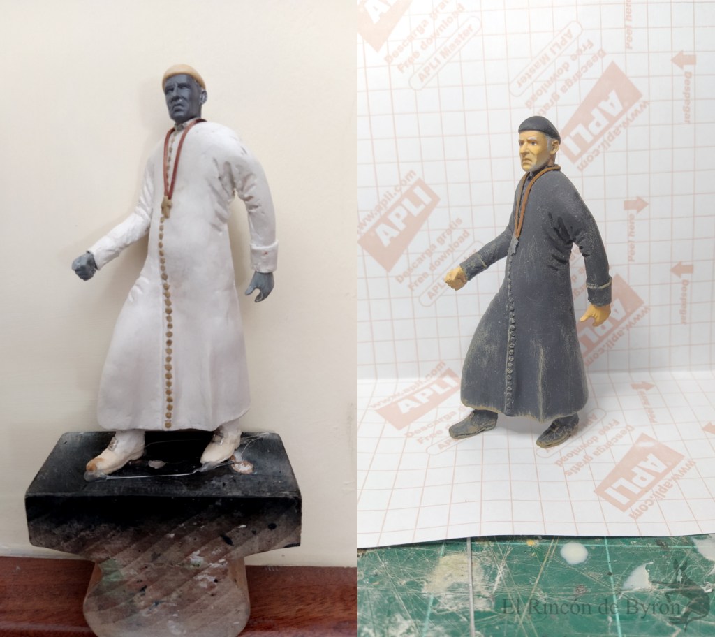 La figura, al igual que otras que hemos realizado cuando no teníamos originales, a partir de un esqueleto de alambre y masilla Das Pronto para el cuerpo y vestido. Las manos son de MiniArt y la cabeza adquirida por Internet, clonada a partir de algún original comercializado. Investigando por Internet, nos encontramos con otros tocados diferentes para sacerdotes o párrocos, pero escogemos el más sencillo ya que se trata de un párroco de pueblo no un obispo o similar.