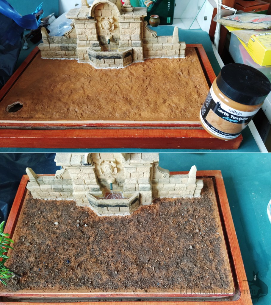 El terreno está elaborado con una base de madera a la que añadiremos la cubierta de una pecera de vidrio que teníamos sin uso. Sobre la base distribuimos una capa de papel-maché, como el de las manualidades escolares, que en capas no muy gruesas nos puede dar un buen rendimiento. Si las capas son muy gruesas, tarda más en secar, y en según qué ambientes se puede ennegrecer por la humedad. Encima de la capa de papel-maché, añadimos una capa de Earth Texture Acrylic, de Vallejo, que hemos utilizado en otras ocasiones. Da también un buen rendimiento en superficie con relativamente poco material. El siguiente paso ha sido espolvorear por encima tierra de jardín -o de cualquier lugar similar que podamos encontrar- con algunas piedrecitas, ya que a la postre los productos naturales casi siempre resultan más idóneos para el acabado final, y luego pintamos el terreno con tonos de colores marrones, blanco y beige, con sucesivas pasadas con pincel seco por encima. La vegetación es la más simple, la típica cobertura de espuma pintada, que distribuimos por el terreno y la fuente con mayor o menor acierto. Como suelo comentar, podíamos haber optado por plantas comerciales quizás más “realistas” (y por tanto, más caras), y acordes con un paisaje del sur, pero como no vamos a participar en ningún concurso, ya nos está bien.