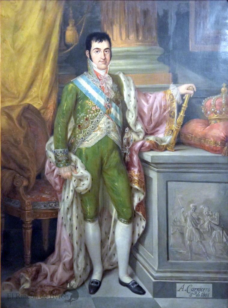 Fernando VII (1784-1833), hijo de Carlos IV y María Luisa de Parma, juró como heredero de la Corona el 23 de septiembre de 1989. Pronto conspiró contra sus padres y el ministro Godoy, favorito de la reina, aprovechando el descontento general y la difícil situación política por la que atravesaba el país. Fomentó el Motín de Aranjuez, a consecuencia del cual fue proclamado rey el 19 de Marzo de 1808, pero ya había comenzado la ocupación francesa. Napoleón convocó a la familia real española en Bayona con la excusa de mediar en sus disputas, si bien obligó al rey Carlos IV y a Fernando VII a renunciar a sus derechos. Fernando pasó la Guerra de Independencia retirado en el castillo de Valençay. La victoria del pueblo español contra el ejército de Napoleón restableció en el trono a Fernando VII, aclamado como «El Deseado», por esperarse de él las tan ansiadas reformas que necesitaba el país, destrozado por la guerra. Sin embargo, el rey restableció el absolutismo, se negó a jurar la Constitución de Cádiz, dando paso a un periodo de persecuciones.