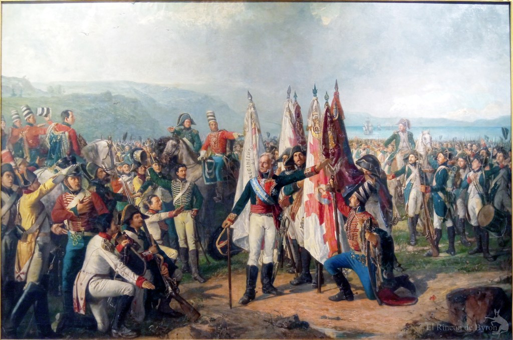 (***) – San Marcial fue una de tantas batallas en la frontera pirenaica entre el ejercito anglo-portugués y español contra las tropas francesas al mando del mariscal Soult, por lo que atribuirle a esta victoria el peso de la salida de los franceses de España se nos antoja del todo inexacto.