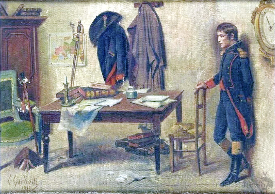 La imagen superior es un cuadro de Louis Gardette que muestra al teniente Bonaparte en su habitación, Grande rue de Valence, en 1791. El pintor se inspiró en otro cuadro conocido: «Bonaparte aux Tuileries» realizado por Nicolas-Toussaint Charlet. La escena de Gardette también tiene similitudes con «La chambre de Bonaparte» del pintor valentino Louis Ageron (1865-1935).2