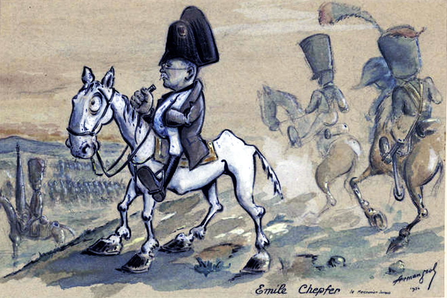 «Este pintor de batallas, con hechuras de coracero del Primer Imperio, es el hombre más amable y pacífico del mundo. Tan pacífico que, para evitar una guerra interna, accedió al deseo de su padres para verlo cincelar metal y luego pintar edificios, cuando él solo aspiraba a dedicarse al dibujo y la pintura — la otra pintura. Además, ¡no hizo mejor que quejarse! Porque un sólido oficio en mano no impidió que Émile Chepfer hiciera arte. Animado por Devilly, luego por Detaille, Émile Chepfer pintó durante treinta años figuras militares y escenas de combate. Lo menos que se puede decir de él es que tiene una habilidad extraordinaria. Es, en el pleno sentido de la palabra, un creador, ya que, de un golpe de pincel, acampa húsares, dragones, guardias, de línea, soldados, sin utilizar modelo alguno y sin infligir a nadie la tortura de la pose. Porque profesa —y su obra lo demuestra— que la pose es la negación del movimiento. Y por eso sus soldados, que nunca existieron en carne y hueso, están tan vivos. Si desdeña utilizar el documento humano, al menos Émile Chepfer, como artista concienzudo, se rodea de todos los elementos que vestirán de verdad histórica a sus personajes. Su taller es un pequeño Museo del Ejército, y las reproducciones de sables, mosquetes, fusiles, armaduras, cornetas, todos esos juguetitos que hacía jugando consigo mismo para conseguir justos efectos de perspectiva, le merecerían un premio en el concurso Lépine. […]»