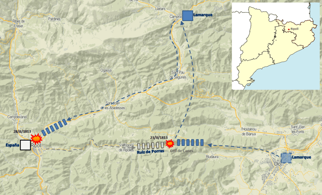 Este general hizo un reconocimiento sobre el collado de Canes (por el antiguo camino real que unía a Olot con Ripoll) sobre la carretera de Vallfogona, donde el 23 de febrero de 1813 tuvieron lugar combates entre los imperiales y una columna española que mandaba el brigadier D. Joaquín Ruiz de Porras1, entre las localidades de Vallfogona y Ridaura; después de un combate inconcluso, Lamarque de repente se dirigió al collado de Sacre, hizo reconocer la localidad de Camprodon y se desplazó rápidamente con su división por San Juan de las Abadesas sobre Ripoll, donde el 28 de febrero de 1813 desalojó a sus defensores de la villa así como de los altos de Nuestra Señora del Negre donde habían intentado defenderse. Las tropas españolas que estaban al mando de su comandante, España, no habían podido reunir a todos sus efectivos para la defensa, por lo que tras una corta lucha se retiraron de Ripoll.