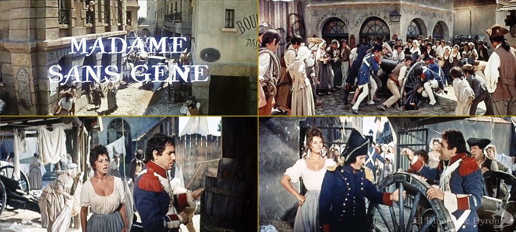 Madame Sans-Gêne es una comedia dramática en tres actos de Victorien Sardou y Émile Moreau, estrenada por primera vez en el Théâtre du Vaudeville de París el 27 de octubre de 1893 y que nos relata las andanzas de Catherine Hübscher, una lavandera de origen alsaciano que llegó a convertirse en la duquesa de Danzig. La obra ha sido llevada a los escenarios y a la gran pantalla en varias ocasiones, una de las últimas en esta producción entre Italia, Francia y España del año 1961, dirigida por Chistian Jacque y protagonizada por una esplendorosa Sophia Loren, bien secundada por Robert Hossein (el mariscal François Lefevbre), Renaud Mary (Fouché) y Julien Bertheau (Napoleón Bonaparte), entre otros.