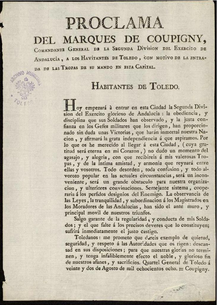 1”PROCLAMA DEL MARQUES DE COUPIGNY, COMANDANTE GENERAL DE LA SEGUNDA DIVISIÓN DEL EXERCITO DE ANDALUCÍA, A LOS HAVITANTES DE TOLEDO, CON MOTIVO DE LA ENTRADA DE LAS TROPAS DE SU MANDO EN ESTA CAPITAL