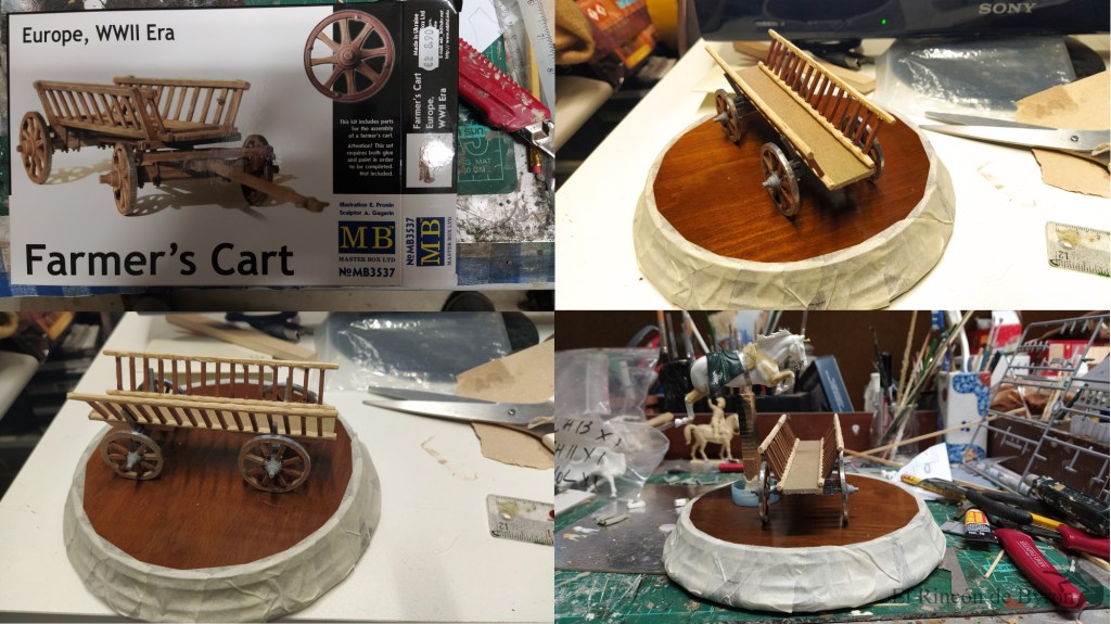 Para reproducir el carro que aparece en la escena, adquirimos en su momento un kit de carro de granjero de la 2ª Guerra Mundial de la marca ucraniana Masterbox. De hecho poca cosa pudimos aprovechar: por lógica, un carro de granja casi 150 años posterior a la época que tratamos, poco tendrá que ver en su estructura, mecanismo de giro y herrajes, con un carro de principios del s. XIX. Por lo que a excepción de los cubos de las ruedas y los ejes con los montantes verticales que parten de ellos, el resto de piezas se han hecho aparte, con trozos de maderitas y DM. El DM lo utilizamos para la base del carro, ya que prácticamente queda casi oculto por la carga y la base del carro del kit era mucho más corta que la que necesitábamos.
