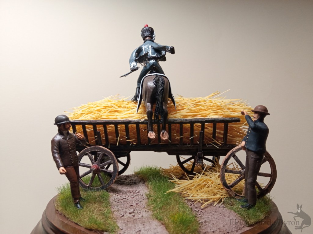 El cargamento (trigo?) que lleva el carro son simplemente hilos sintéticos amarillos cortados de una cabeza de escoba, que se asemejaba por el tono. Quizás tendrían que haber sido más estrechos o cortados más cortos, darles alguna tonalidad marrón, pero lo que me interesaba sobre todo era que diera sensación de volumen y desorden. Otro reto ha sido el que quedaran más o menos sujetos a la base y paredes del carro, proyectando una mezcla de pegamento y agua, la solución usual, pero en varias fases a medida que iban aumentando las capas. Con todo hay trozos que han quedado sin sujetar por temor a que la proyección del pegamento aguado nos arruinase la pintura del carro.