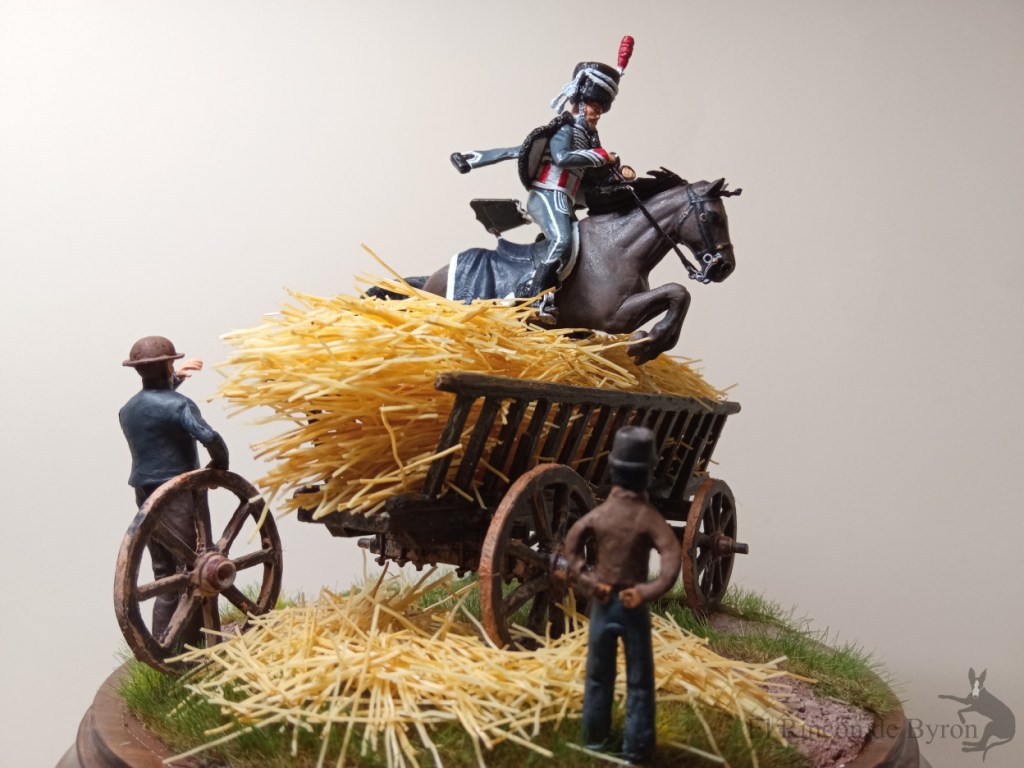 La figura del cazador nos sirvió prácticamente toda, excepto la pelliza (la chaqueta típica de los húsares) que tuvimos que hacerla de nuevo –excepto una de las mangas- con masilla bicomponente (en este caso de Tamiya). Comentar que el cuello de la chaqueta está demasiado ajustado, por algunas reproducciones y la propia película, la caída de la prenda era mucho más abierta y alejada del cuello, aunque el kit de Historex original que utilicé para otra figura tampoco difería demasiado. También hubo que variar el ángulo de las rodillas, más cerrado, ya que el jinete se abate en dirección al cuello del caballo cuando realiza el salto. Uno de los paisanos, con sombrero y barba, es original de Nemrod sin ninguna modificación; el otro paisano era de origen un oficial con bicornio de Historex, que reconvertimos al paisano que sostiene la rueda del carro, y el chico que observa la escena està hecho con masilla y alma de alambre, recortando una cara de otro kit de Historex.