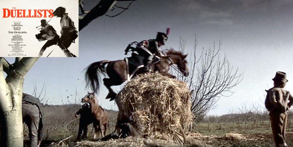 La película de «Los Duelistas» (1977), de Ridley Scott, trasladando a la pantalla la novela de Joseph Conrad, ha sido unánimemente alabada por su fidelidad en la recreación de la época napoleónica, sus ajustadas interpretaciones, la reproducción del vestuario y los uniformes así como la coreografía de las luchas con espada. En su momento ya tratamos sobre la película en nuestro blog, por lo que quisimos reproducir tan solo un momento concreto de la misma, la escena del duelo a caballo, que se desarrolla en una arboleda entre la bruma matinal con un almuerzo campestre de los curiosos asistentes como peculiar telón de fondo. Al final, por cuestiones de composición de la escena y las figuras, optamos por una imagen posterior a la del duelo a caballo, aquella donde el personaje del húsar Armand d’Hubert (interpretado por Keith Carradine), saliendo vencedor del duelo y viendo una carreta atravesada en el camino de vuelta decide saltar por encima de ella, con gran fastidio de la gente que la estaba reparando y que se había tenido que apartar precipitadamente de la acometida del jinete.
