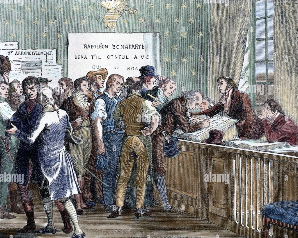 ¿Cómo interpretará el príncipe la voluntad del pueblo? El gran invento de la época de la Revolución y del Imperio y que luego siguió siendo la modalidad dominante durante la mayor parte del siglo XIX: el plebiscito. El plebiscito es una cosa maravillosa, lo conocimos en el momento de la unificación de Italia, por ejemplo, en todas las diversas regiones anexadas cada día al reino de Saboya, habían plebiscitos. Por ejemplo, en Saboya o en Niza cuando en cambio fueron cedidas a la Francia de Napoleón III. El plebiscito es la gran modalidad en que el 1800 mantiene unidas dos cosas: la soberanía es del pueblo. El pueblo debe ser involucrado y hacerlo votar, pero como el pueblo nunca sabe realmente lo que realmente quiere, es necesario que luego se controlen las cosas. El plebiscito funciona para que todos voten, naturalmente, porque los varones adultos lo pueden entender, pero todos, analfabetos hasta los analfabetos, pobres, no importa, todos. Todo hombre nacido y residente en Francia que haya cumplido 21 años es un elector y los plebiscitos sí, la participación no es enorme: cuando sale mal están en el 20 por ciento de los votantes cuando todo va bien se acerca al 50 por ciento y a la gente se le pregunta: ¿Usted quiere que Bonaparte sea Primer Cónsul, quiere que sea Cónsul de por vida, quiere que sea Emperador? Y la gente sabe que su opinión importa. Por supuesto, los plebiscitos se pueden hacer de muchas maneras, pero estos son bastante buenos, se escribe todo, están los registros y se transcriben todos los votos y luego se envían los registros a París, al Ministerio del Interior. Y luego el Ministerio del Interior, después de haber hecho desaparecer los registros en sus sótanos, compila el panorama general final del voto agregando, ya que están, los votos del ejército, cientos de miles de hombres, que votan por aclamación… Y luego el Ministerio de Interior publica los resultados: para el plebiscito de 1800 para el Consulado de por vida – el Ministro del Interior es, nuevamente, Luciano, el «Gran Hermano» – 3.600.000 sí, 8000, no. Como dirá un simpatizante que se cree que estaba bromeando: “Es la democracia, purgada de sus propios inconvenientes”