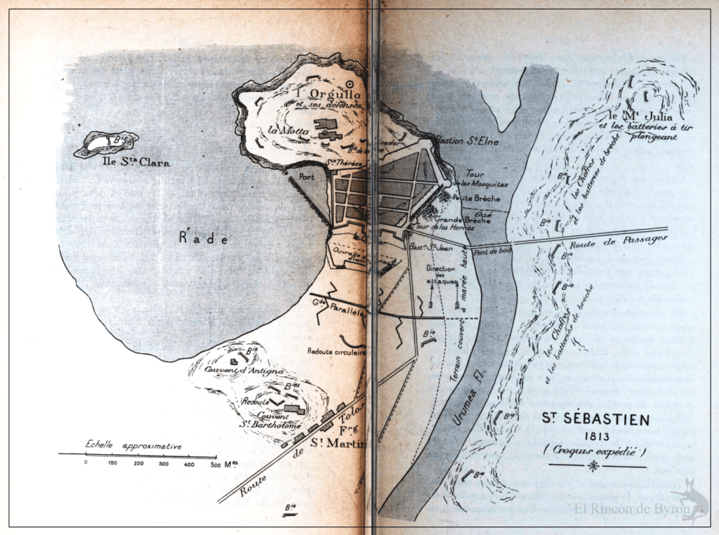 ● (El Rincón de Byron): Est-il encore frappant que le siège subi par Saint-Sébastien en août 1719 par les troupes du Duc de Berwick ait été mené selon les règles «civilisées» des sièges de l’époque (dont l’engagement du Duc à protéger la population), et au contraire en 1813, près de 100 ans plus tard, alors que les Lumières rationalistes influençaient la culture européenne, un autre duc, en l’occurrence Wellington, n’empêcha pas (ou pouvait-il empêcher) tous les excès qui suivirent ce siège? Le dénouement ne cesse-t-il pas d’être encore plus frappant, étant donné le soutien important de la Royal Navy, et donc du gouvernement britannique, aux forces espagnoles et de guérilla de la région dans leur lutte contre les Français à partir de l’année 1812?