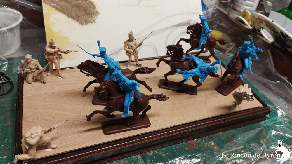 Hacemos una primera composición de la probable ubicación de las figuras. Podrían parecer demasiadas figuras en un principio para una base relativamente pequeña, pero me interesaba dar la sensación de choque de la caballería con varias figuras y los infantes intentando defenderse de la agresión. Los kits de la marca Italeri son bastante sencillos, no están muy elaborados, y a menudo se limitan a duplicar las piezas en sus posiciones básicas, con lo cual el repertorio de posiciones de las figuras queda bastante reducido, y si queremos hacer alguna variación en las posturas habrá que hacer los consabidos retoques, cortando y modificando piezas con masilla.