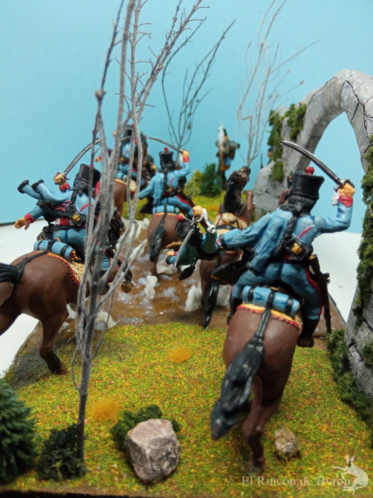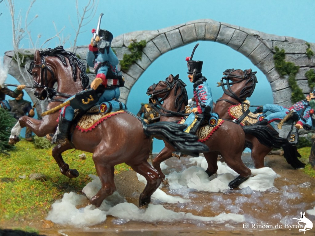 Esta semana os traemos otra escena basada en la Guerra de Independencia, con un encuentro entre una unidad de infantería ligera, los Tiradores de Castilla, y un piquete del 3º de húsares francés, que en mayo de 1812 formaba parte con dos escuadrones de la división de caballería ligera del Ejército de Portugal al mando del general Curto. La acción, totalmente ficticia, tiene como trasfondo el singular Puente de los Diablos o de las Brujas, situado a unos 25 kilómetros de Salamanca.