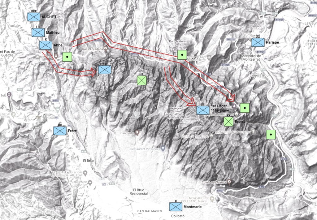 El general Suchet fue nombrado mariscal por el emperador Napoleón (Decreto en Saint-Cloud el 8 de julio de 1811) por sus conquistas consecutivas de Lérida, Mequinenza, Tortosa y Tarragona. Junto con el decreto se hallaba una instrucción2 que ordenaba demoler Tarragona, conservando tan solo un reducto, tomar Montserrat y marchar a continuación sobre el reino de Valencia. El ataque sobre Montserrat, que desde 1810 era considerado como una plaza fuerte por parte española, buscaba dejar sin un punto de apoyo al 1er ejército, o de la derecha, de Cataluña y desbloquear la ruta entre Lérida y Barcelona.