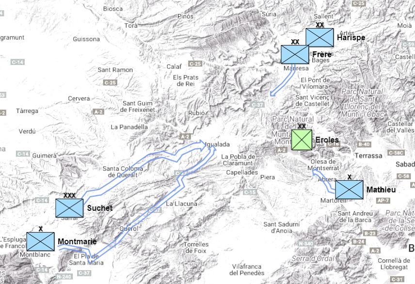 El 22 de julio el general Montmarie se desplazó de Montblanch a Igualada, mientras que los generales Frère y Harispe avanzaron por Manresa y el general Maurice Mathieu, con una columna venida de Martorell ocupaba Esparreguera. El día 23 el recién nombrado mariscal Suchet de desplazaba hacia Igualada por Sarral y Santa Coloma de Queralt. Suchet llegó al albergue de El Bruch el 24 de julio de 1811, donde se reunió con todos sus generales para planear el ataque.