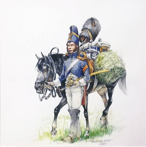 Por ejemplo, el uniforme que dibuja Temnikov correspondería al periodo aproximado de 1806-09 y el que yo he elegido correspondería a un periodo posterior para un uniforme de marcha, 1810-1813, aunque con las salvedades que uno quiera establecer. Básicamente yo me he basado en tres publicaciones bastante conocidas, cuyas referencias tenéis en el apartado final de Fuentes: