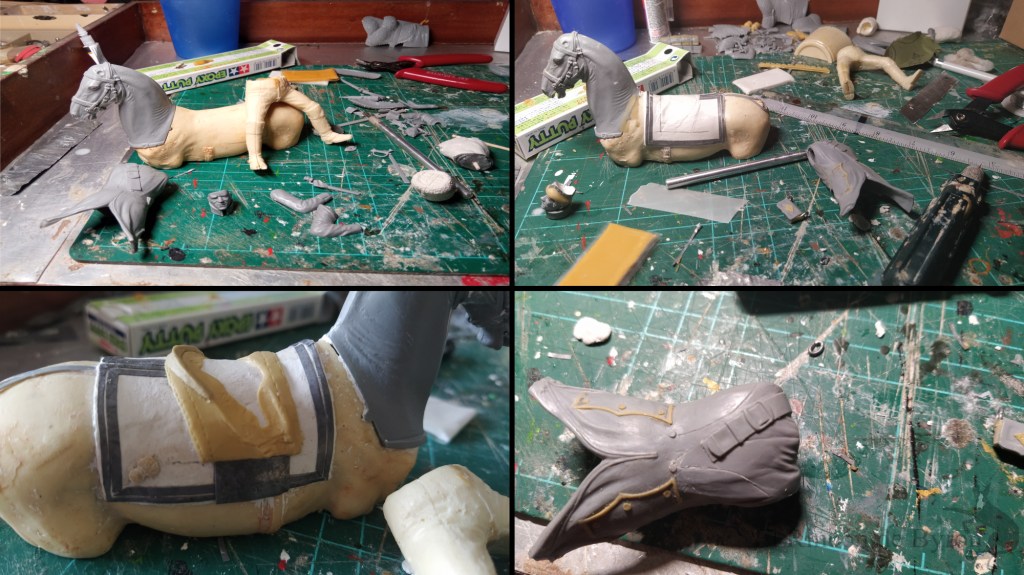 El proceso de montaje de las figuras comienza con el caballo, del que aproveché un cuerpo clonado que hice hace tiempo con resina de dos componentes. El acabado no es muy pulido, pero con papel de lija de grano fino, se pueden afinar las impurezas y resaltes menores y con un cutter las más exageradas y rellenando con masilla los pequeños agujeros que surgen a veces con el proceso de fraguado. Las piernas del jinete también provienen de un clonado de otra figura. Para el resto de las piezas aprovecho un kit de dragón a caballo a escala 1:15 de la marca MiniArt, ya que el uniforme es similar en su parte anterior y en la parte posterior solo hay que hacer algunas modificaciones con masilla.