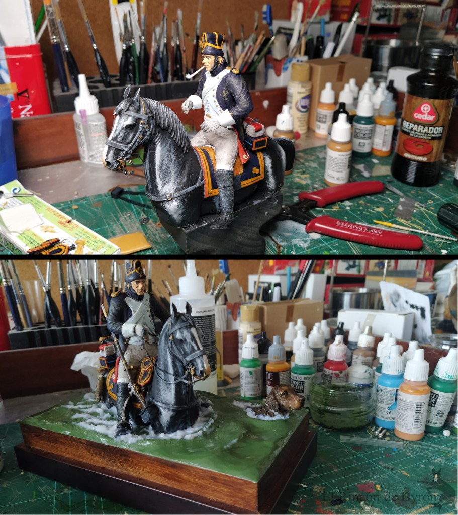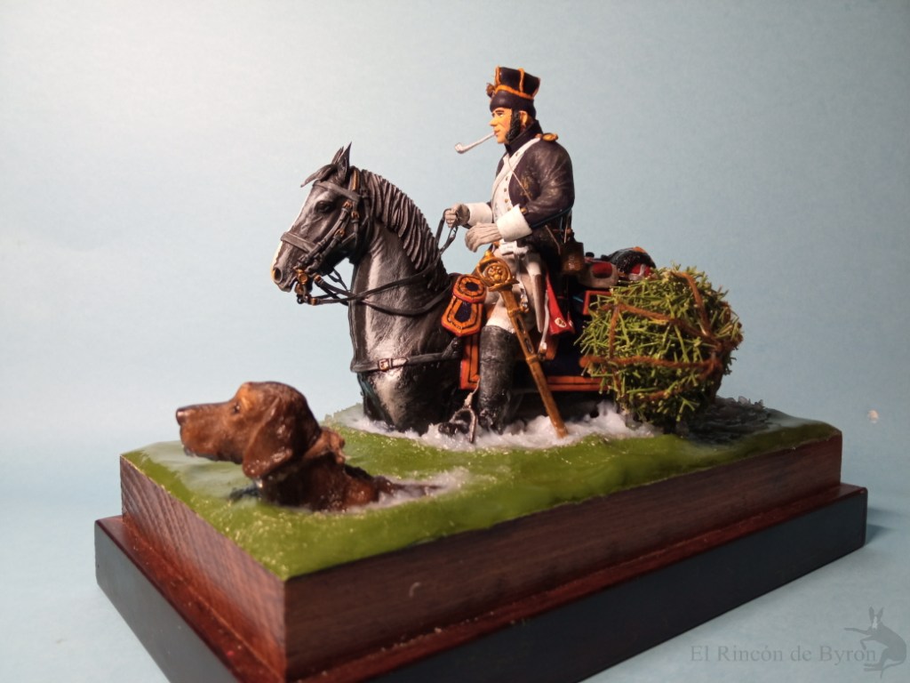 Casi acabando este mes de noviembre, volvemos al ámbito de las miniaturas militares, con esta escena de un jinete de la afamada unidad de los granaderos a caballo de la Guardia Imperial francesa, y su perro, que vadean un rio viniendo de forrajear y procurarse algo de caza como sustento. Los granaderos a caballo de la Guardia intervinieron en varios escenarios durante el periodo consular e Imperial, como Italia, Alemania, Chequia, España, Rusia, Austria, Francia y en la campaña de los 100 días.