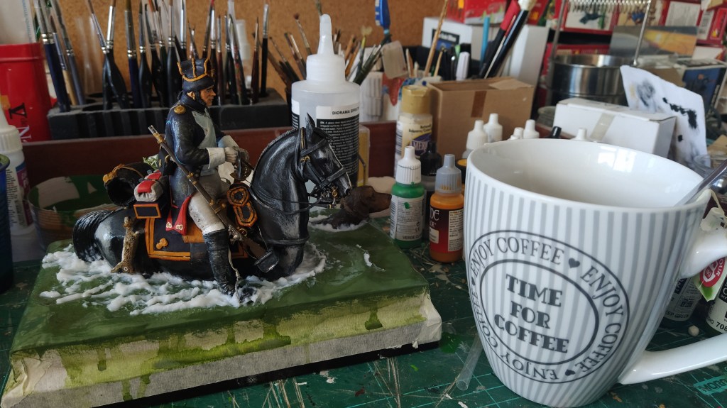 Hace tiempo que vi una original viñeta de un abanderado federal americano vadeando un curso de agua. obra del artista norteamericano Frank McCarthy y me surgió la idea de adaptarlo a la época napoleónica, también con un jinete a caballo. Primero pensé en un garrochista español, luego en un lancero francés o un cosaco ruso. Finalmente opté por una figura de granadero a caballo de la Guardia Imperial francesa, basado en una imagen del artista y recreador ruso Alexei Temnikov, con un granadero caminando al lado de su caballo, fumando tranquilamente su pipa, viniendo probablemente de labores de forrajeo. Otro de los motivos era tratar una unidad famosa en la épica napoleónica, los Grenadiers-a-cheval de la Garde, que se hicieron conocidos por su austeridad y comportamiento altivo.