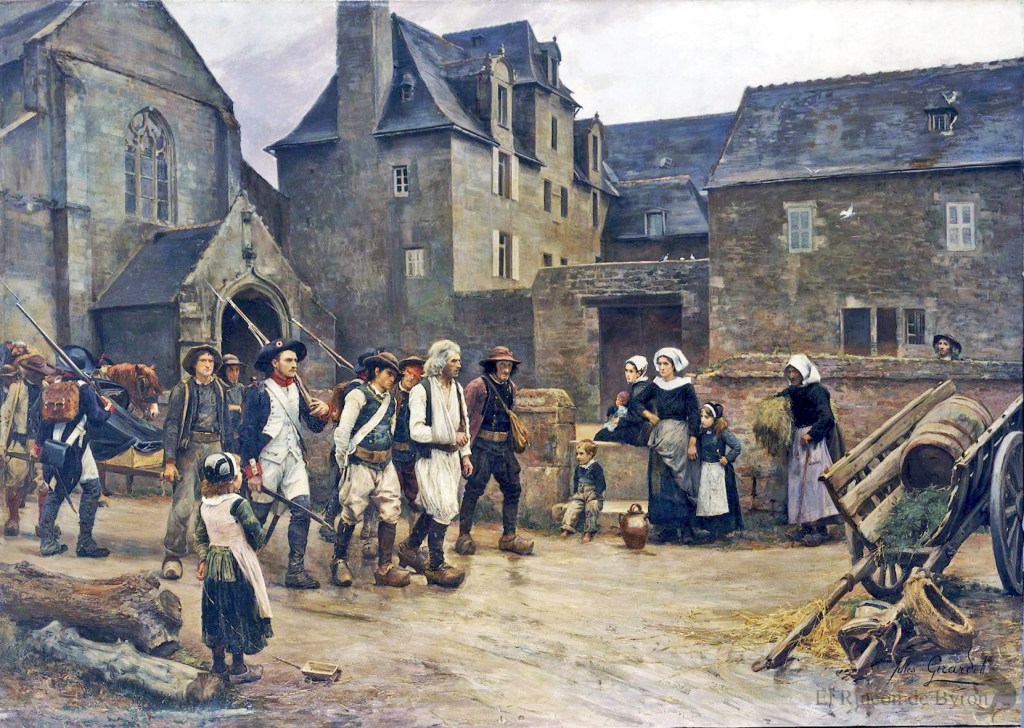 Jules Girardet se especializó en representaciones de la guerra de contrarrevolución en Bretaña, y éstas tuvieron cierto éxito en los años próximos al centenario de 1789. Los hechos ocurridos en Fouesnant en 1792 fueron más una noticia que una revolución. El prisionero al frente del convoy se parece al cabecilla, pero en realidad fue arrestado mucho más tarde y el convoy nunca pasó frente al priorato de Locmaria en Quimper. La acumulación de detalles pretende transmitir la intención del artista de presentar un «documental serio», aunque se tome ciertas libertades con la historia. (l)