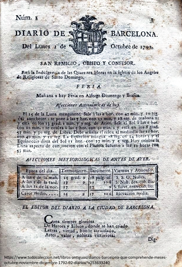 El «Diario de Barcelona«, que iría indisolublemente unido en el tiempo a la familia Brusi y sus herederos, hasta conocerse popularmente como «El Brusi«, en realidad fue fundado y editado en su primer número de 1 de octubre de 1792, por Pedro Pablo Hudson de Lapazaran, un oficial de la Corona de origen napolitano que se había instalado en la Corte de Madrid. El mismo Hudson había solicitado por escrito al Ayuntamiento de Barcelona poder incluir en la cabecera del «Diario…» el escudo de la ciudad, como reafirmación de su denominación. Su sede se encontraba en la calle Palma de San Justo.