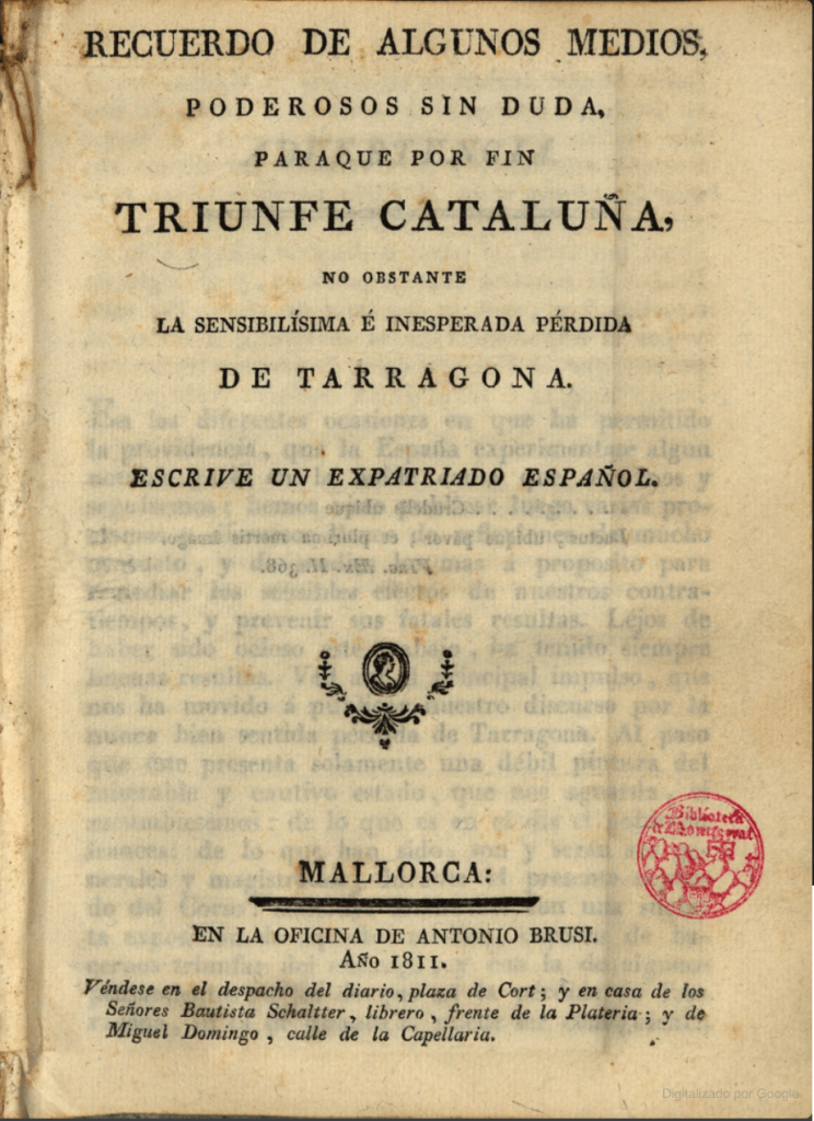 Cuando después de un asedio de casi dos meses la ciudad de Tarragona cayó en manos de las tropas de Suchet el 29 de junio de 1811, se activó la organización para que los Brusi pudieran huir y, a pesar de haber perdido casi la totalidad de la imprenta y sus accesorios, embarcarían hacia Mallorca5 después de la pérdida de la ciudad. A la llegada a las Baleares, su actitud será aún mucho más activa contra los franceses como lo demuestran muchas de sus publicaciones, pero también le sirve el hecho a la familia Brusi-Ferrer como un periodo para estabilizarse económicamente. Antonio Brusi monta una imprenta en Palma de Mallorca donde publican el «Diario de Palma» y donde junto con su mujer realizan parte de su vida social, ya que la imprenta, al parecer, era una «especie de reunión y entrevista de los refugiados catalanes». [5]
