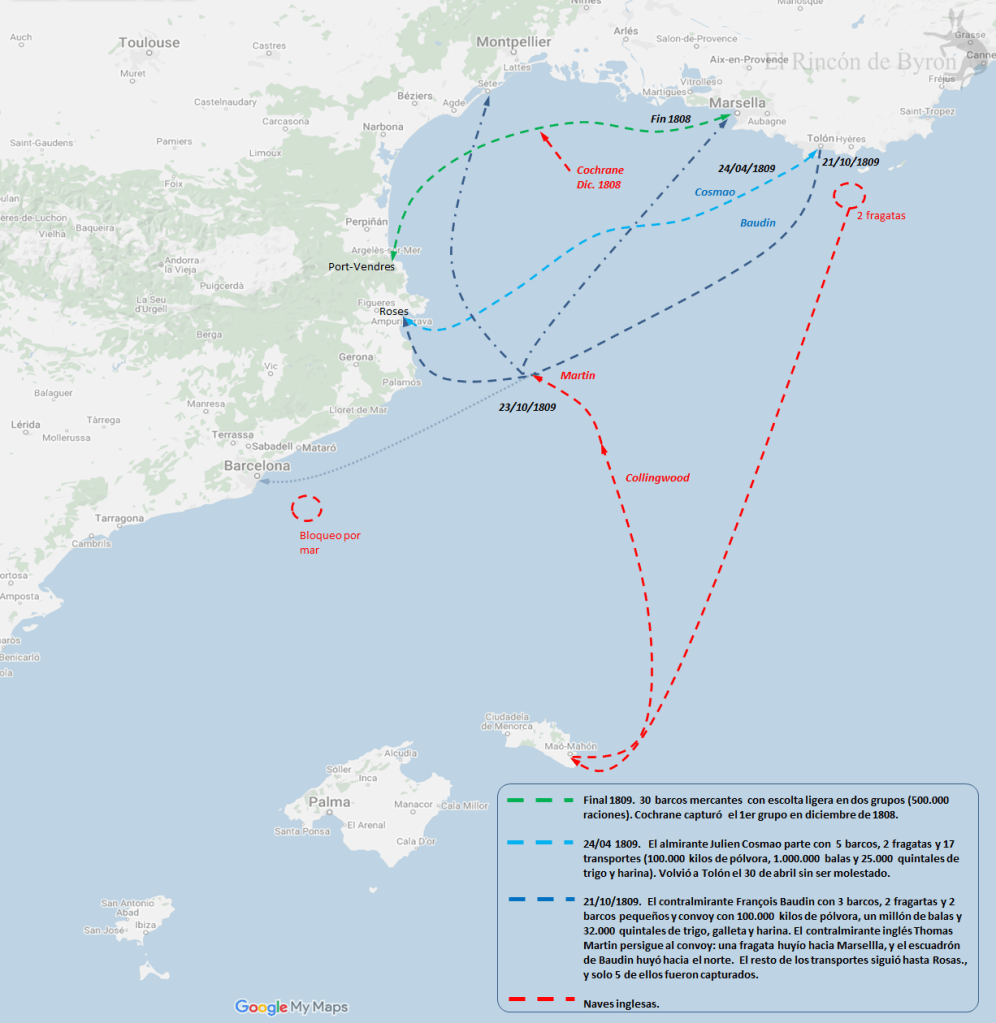 La geografía de la Península Ibérica también aseguraba que el poder marítimo jugaría un papel importante, particularmente en el ámbito del apoyo logístico. Esto fue más evidente para los británicos, cuya armada les permitió no solo desplegar un ejército en ultramar sino también financiar los ejércitos de sus aliados ibéricos.52 En comparación con los británicos, las operaciones navales francesas en apoyo de la campaña española han sido generalmente olvidados en las narrativas de la Guerra de la Independencia, a pesar de su importante impacto en el curso de la guerra. Aunque Francia compartía frontera con España, los Pirineos presentaban un importante obstáculo para trenes de suministro terrestres. Tan pronto como Barcelona cayó en manos francesas, Napoleón planeó utilizar este puerto para recibir los envíos de trigo y galletas de Marsella.53 Durante un tiempo, Napoleón incluso contemplaba enviar provisiones a Junot en Portugal utilizando barcos más pequeños, que podrían navegar en aguas costeras poco profundas y, por lo tanto, evadir a los cruceros británicos.54 En agosto, con Barcelona sitiada por tierra por un ejército español y bloqueada en el mar por una flota británica, Napoleón tuvo que desviar los envíos de provisiones a la cercana Port-Vendres. En el transcurso de octubre y noviembre, los trabajadores en Marsella cargaron 30 barcos mercantes con alrededor 500.000 raciones. Divididos en dos grupos, estos barcos con escolta ligera zarparon a finales de 1808.55 Mientras que la segunda división llegó a salvo a Port-Vendres, la mayor parte de la primera división fue capturada por el famoso capitán británico, Thomas Cochrane, en diciembre de 1808, quien había estado quemando estaciones de telégrafo francesas a lo largo de la costa mediterránea.56 Las pérdidas sufridas por este convoy pueden haber sido el catalizador para que Napoleón ordenara posteriormente pequeños escuadrones para escoltar futuros convoyes. A finales de marzo de 1809, Napoleón ordenó al almirante Honore Ganteaume, comandante de la flota de Tolón, que enviara una escuadra de 5 barcos y 2 fragatas para escoltar varios transportes a Barcelona.57 El 24 de abril, la escuadra del almirante Julien Cosmao partió con 17 transportes cargados con 100.000 kilos de pólvora, un millón de balas y 25.000 quintales de trigo y harina. Después de descargar estos suministros en loa bahía de Rosas, Cosmao navegó de regreso a Tolón el 30 de abril sin ser molestado, aunque por poco se encontró con una flota británica de 14 barcos.58 Dado el éxito de esta salida, otro envío de un millón de balas, cien mil kilos de pólvora, 32,000 quintales de trigo, harina, galletas se cargó a bordo de 17 transportes en septiembre. Inicialmente, Ganteaume contemplaba zarpar con los 15 barcos de la flota de Tolón, creyendo que superaba en número a la flota británica de 11 barcos bajo el mando del almirante Cuthbert Collingwood. Cuando Collingwood abandonó su estación frente a Tolón, Ganteaume sospechó que la flota británica había regresado a su puerto en Menorca. Ganteaume, aprovechando esta oportunidad, optó por enviar sólo una pequeña escuadra de 3 barcos, 2 fragatas y 2 embarcaciones menores, al mando del contralmirante François Baudin, para escoltar el convoy hasta Barcelona.59 Sin embargo, la partida de Baudin el 21 de octubre , no pasó desapercibido ya que Collingwood había dejado dos fragatas británicas para seguir a Toulon; corrieron a Menorca para informar de los movimientos franceses.60 Aunque la flota británica efectivamente había zarpado hacia Menorca, Collingwood no permaneció mucho tiempo en el puerto. Al escuchar los rumores de la partida inminente de la flota de Toulon, Collingwood ya había zarpado con 15 barcos y 2 fragatas el 13 de octubre. Deduciendo fácilmente que el convoy francés se dirigiría a Barcelona, Collingwood estableció un crucero para interceptar a Baudin y su convoy.61 Al divisar el convoy francés en la mañana del 23, Collingwood envió al contraalmirante Thomas Martin con los ocho de sus barcos más rápidos para perseguirlos. Mientras una de las fragatas francesas corría de regreso a la seguridad de Marsella, el resto del escuadrón de Baudin huyó hacia el norte, hacia la costa francesa. Aunque una fragata británica logró capturar cinco transportes, la mayoría del convoy francés eludió la captura y continuó su curso. Mientras tanto, al llegar al puerto de Cette, solo un navío de línea de Baudin y una fragata pudieron navegar con éxito en las aguas poco profundas; los otros dos barcos encallaron.62 Temiendo su captura, los franceses prendieron fuego a ambos barcos. En cuanto al convoy, los barcos restantes llegaron a la bahía de Rosas y comenzaron a descargar rápidamente su carga. Para cuando los británicos pudieron lanzar una expedición exitosa para aislar a los barcos franceses durante la noche del 31 de octubre al 1 de noviembre, los barcos ya habían logrado descargar la mitad de su carga de manera segura en tierra.63 Por lo tanto, los esfuerzos de Frances para reabastecer su Las fuerzas en España por mar habían tenido un éxito mixto y pérdidas significativas. Mientras Napoleón pensaba en intentar otro envío a fines de 1810, advirtió a Decrès que «sobre todo, no quiero arriesgar ninguno de mis navíos de línea, quiero usar solo fragatas«. Incluso contempló si una cantidad suficiente. de los suministros pasarían, incluso si solo un tercio de los barcos llegara a su destino.64 Finalmente, Napoleón abandonó todos los planes para enviar suministros a España, prefiriendo intentar que la campaña se financiara sola a través de contribuciones forzadas del pueblo español.