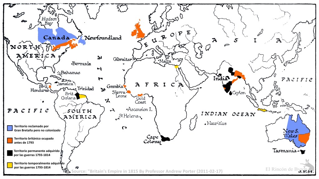 g- Mapa del autor a partir de «Illustration from page 521 of The outline of history; being a plain history of life and mankind, the definitive edition revised and rearranged by the author, by H.G. Wells, illustrated by J. F. Horrabin», «The British Empire in 1815 [Mercator’s Projection]» y https://www.bbc.co.uk/history/british/empire_seapower/britain_empire_01.shtml