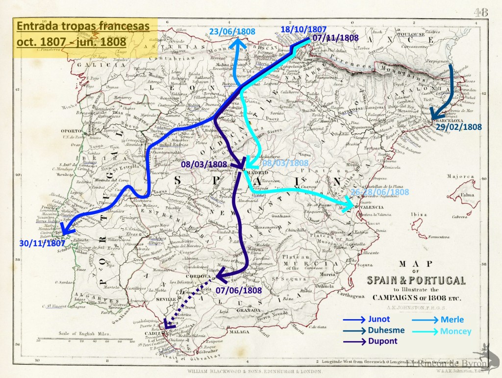 h – Mapa del autor a partir del «Atlas to Alison’s History of Europe, 1850», by Alex. Keith Johnston, published by William Blackwood and Sons in 1850. Plate 48. «Map of Spain and Portugal to illustrate the campaigns of 1808 etc.» http://www.maproom.org/00/13/present.php?m=0048
