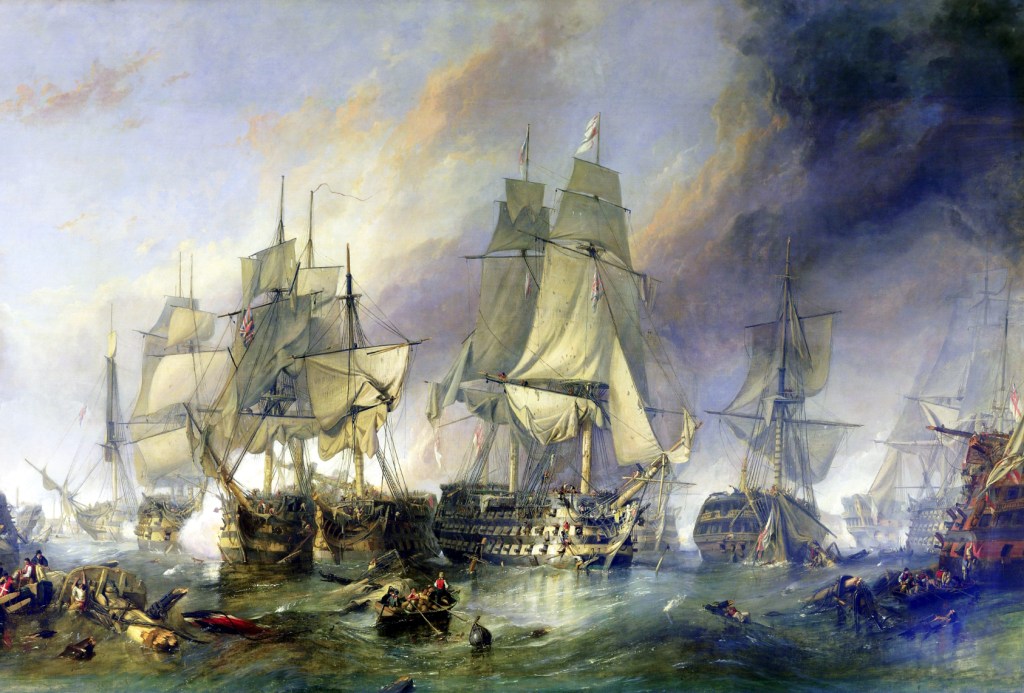 La défaite à la bataille de Trafalgar (21/10/1805) scelle le sort de la flotte franco-espagnole et les tentatives de Napoléon de défier la Royal Navy pour le contrôle des côtes européennes à court terme. (b)