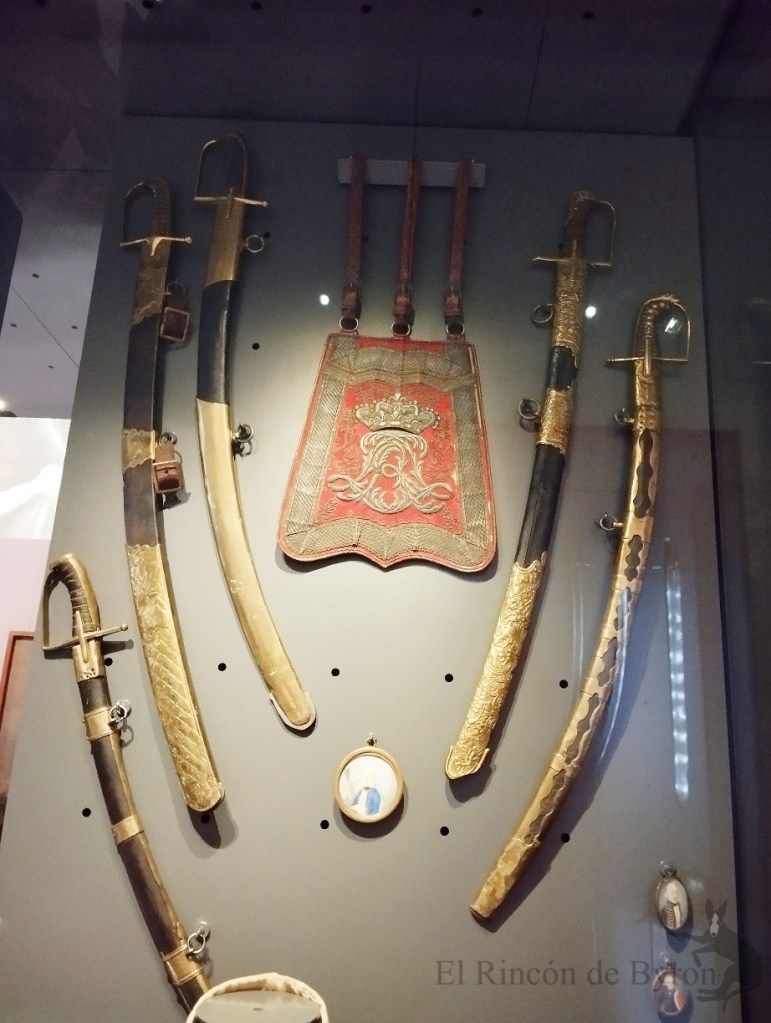 10 – Sable a la húngara y su vaina s. XVIII (izq.); 11 – Sable de Oficial y su vaina a la Húngara s. XVIII; 12 – Portapliegos de Oficial regimiento Bercheny; 13 – Sable de oficial y su vaina a la húngara s. XVIII; 14 – Sable y su vaina Modelo 1777(der.); 15 a 17 – Tres retratos de húsares. Óleo sobre vidrio. Finales s. XVIII