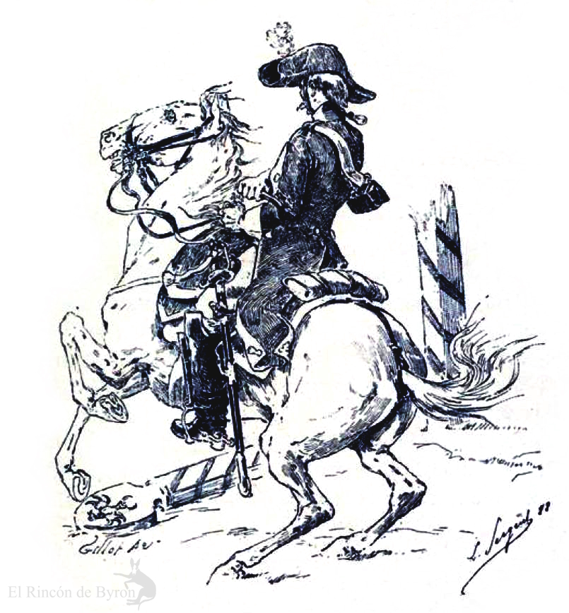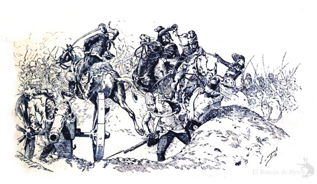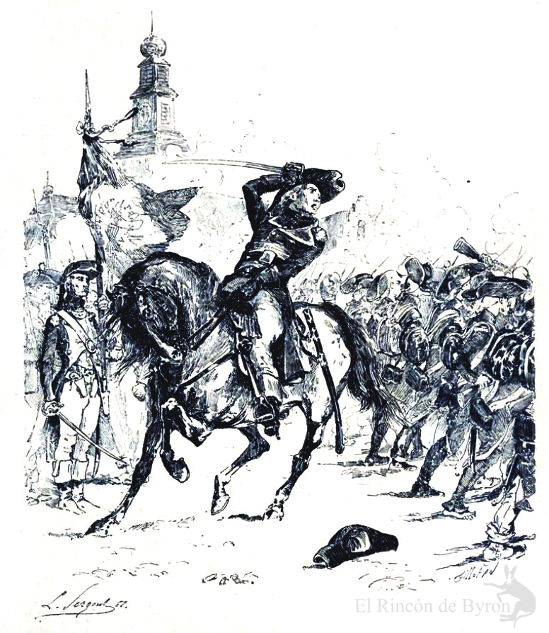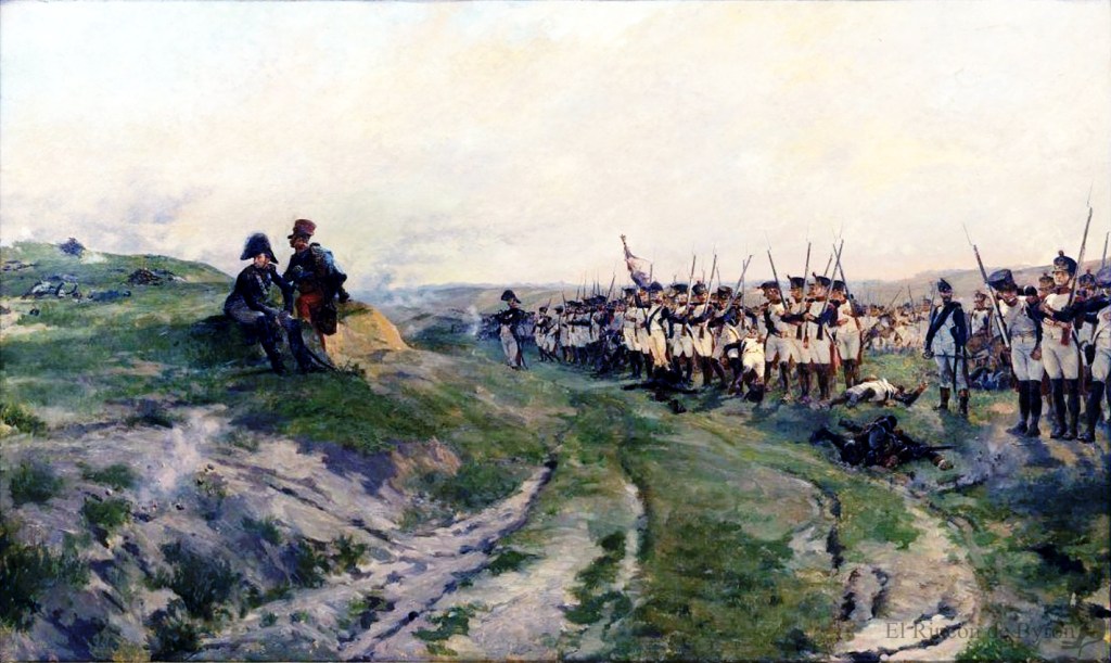 «Abrumados por el número, barridos por la formidable artillería de los austriacos, nuestro ejército cedía ya, las líneas se rompían y, en los caminos, las tropas se retiraban desordenadamente, gritando que todo estaba perdido. Eran sólo las diez de la mañana; era la derrota. «Vimos al cónsul – dice el capitán Coignet en sus cuadernos – sentado en el terraplén de la carretera principal de Alejandría, sujetando su caballo por las riendas… las balas de cañón rodando por el camino, no las veía…» Y en este rostro hundido, tan fuerte, febrilmente enérgico, voluntarioso y nervioso, está toda la ansiedad del general que, por primera vez, duda de su estrella.