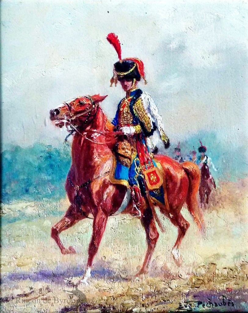 El protagonista de nuestra entrada semanal, el pintor e ilustrador francés Eugène Péchaubès dedicó su actividad creativa en exclusiva al mundo de los caballos, en todos sus aspectos: escenas militares (con especial atención a los jinetes de caballería del Ir Imperio, escenas de caza, escenas de trabajo en el campo de campo, aunque una buena parte de su vasta producción se dedicó a ilustrar las carreras en los hipódromos, donde pronto fue muy conocido en la comunidad ecuestre, contando con una clientela fiel y entusiasta, entre la que se encontraban militares, propietarios de caballos y entrenadores.