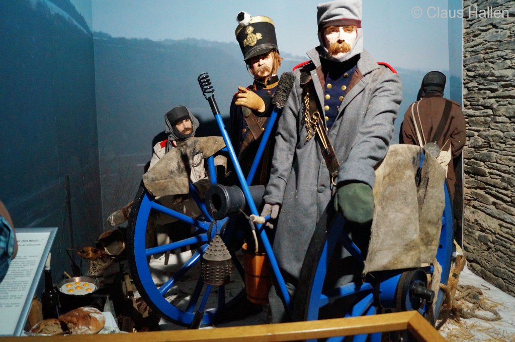 Una y otra vez aparecen representaciones a tamaño natural de los soldados, tanto aliados como franceses. Varias vitrinas contienen un número considerable de armas y equipos, que también permiten comparaciones directas. El cruce se visualiza mediante un gran diorama con figuras planas pintadas y una viñeta del tamaño de una pared de la vida en el campamento con figuras de tamaño natural. El diorama, por cierto, tiene la misma perspectiva que la pintura circular del cruce del Rin creada en 1902, de la que hablaré más adelante. La viñeta es expresiva. En el borde mismo se encuentra incluso un soldado con el antiguo uniforme del Gran Ducado de Berg. Sin embargo, cabe señalar que esta fuerza se desplegó principalmente frente a los bastiones en la margen derecha del Rin, cerca de Maguncia, por lo que probablemente no participó en el cruce de Kaub.