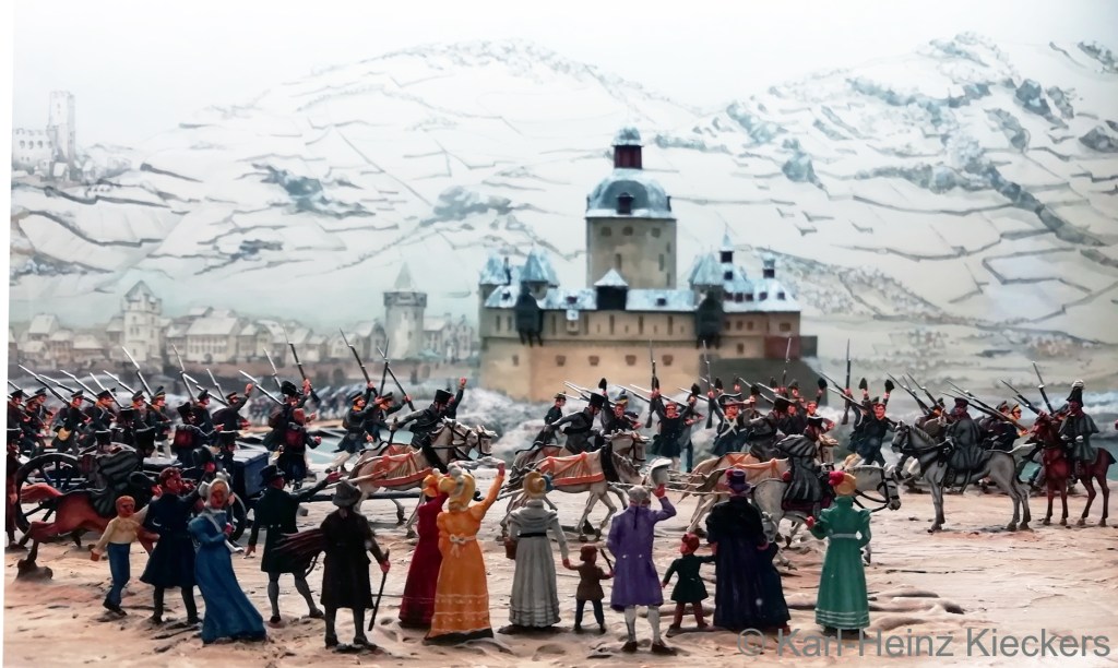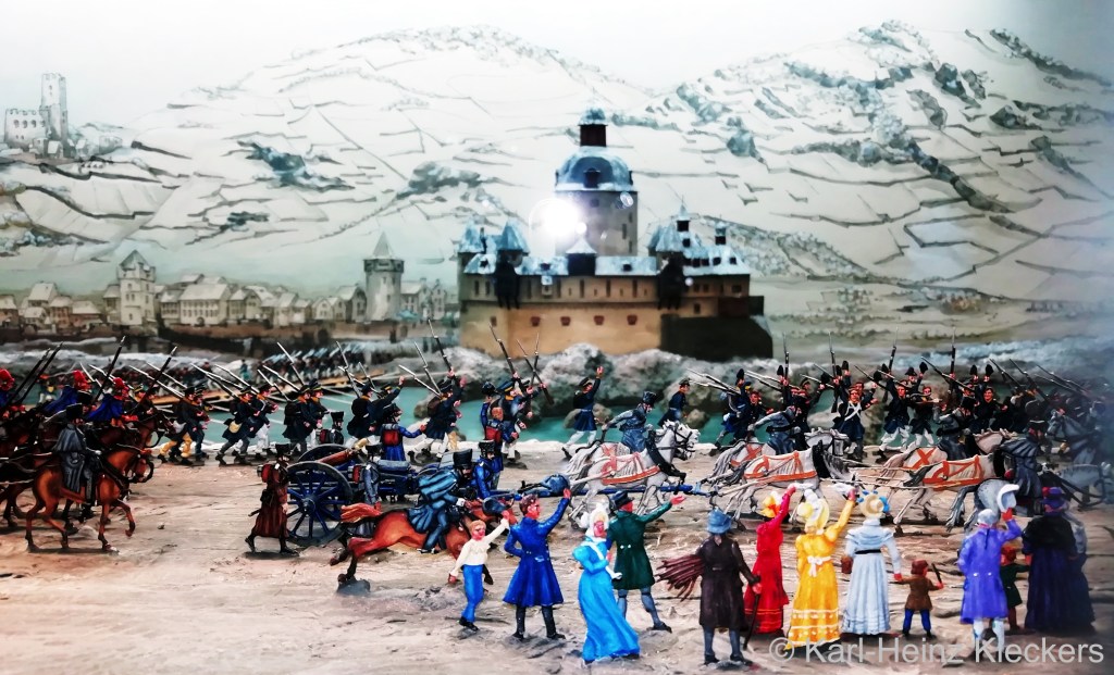 El diorama del paso del rio Kaub, con las típicas figuras planas de peltre. / Diorama of the Kaub River crossing, with the typical flat pewter figures.