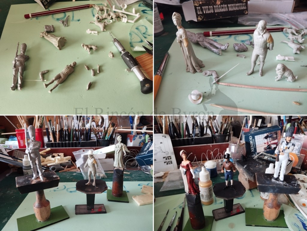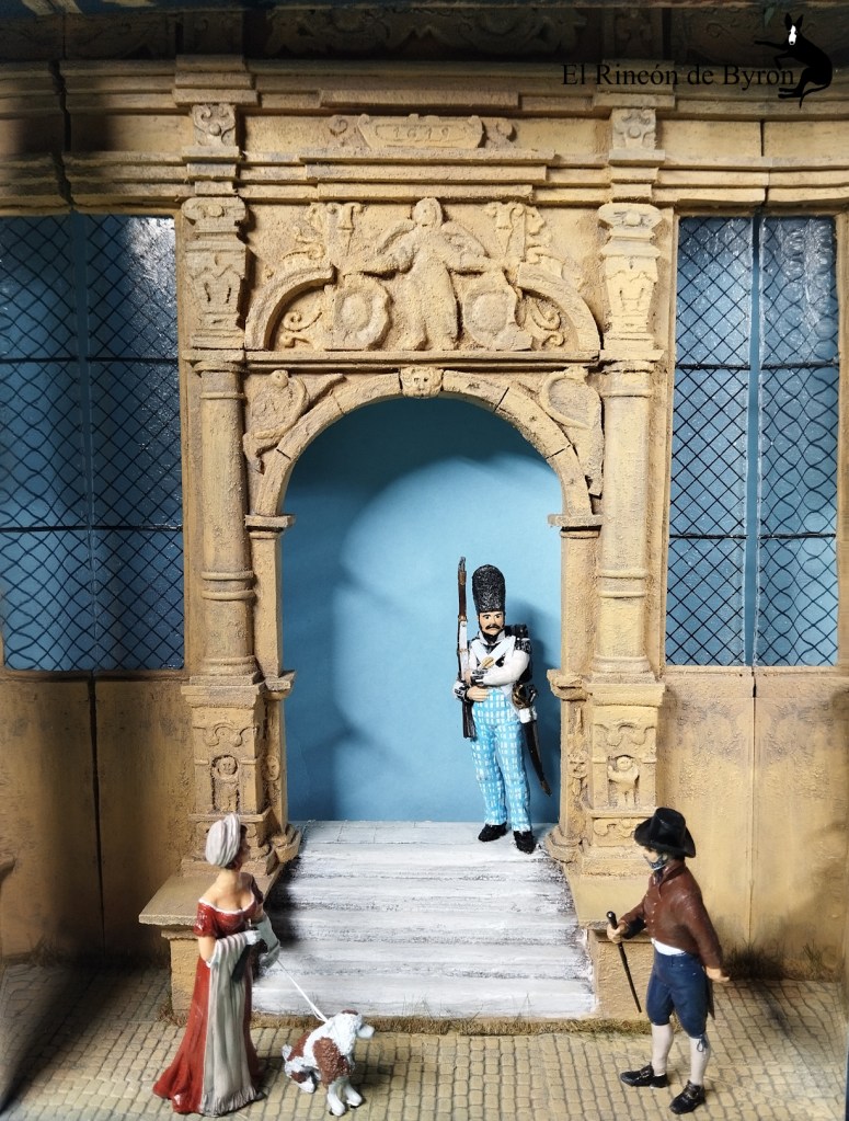 Partimos de cuatro miniaturas para nuestra escena, un soldado, un señor paseando y una señora con su perro. No muchas marcas tienen civiles de esta época napoleónica, o que puedan aprovecharse, por lo que afortunadamente nos quedaba un kit de figuras de la casa francesa Historex, de su serie Nemrod, de las que me quedaban por utilizar las dos últimas figuras. El material de estas figuras es bastante decente para trabajarlo, y no ha habido mayores problemas en variar la posición inicial de las figuras, con masilla y unos conectores metálicos para unirlos a la pieza central del cuerpo. El soldado es un sargento de los granaderos del regimiento Zamora de 1807 (los soldados no tenían charreteras, y los oficiales las llevaban blancas, al parecer). Quería que fuera un soldado para la pretendida ubicación de la figura, en el umbral de la puerta, como estando de guardia, pero la figura ya estaba pintada para quitarle las charreteras negras como signo distintivo. La figura es de la marca El Viejo Dragón, que compré hace ya unos años en una feria de juegos en Barcelona. La figura tiene un buen fundido, sin apenas rebabas, y las piezas adicionales de la mochila, cartuchera y el pequeño sable de infantería con la bayoneta han encajado bien.