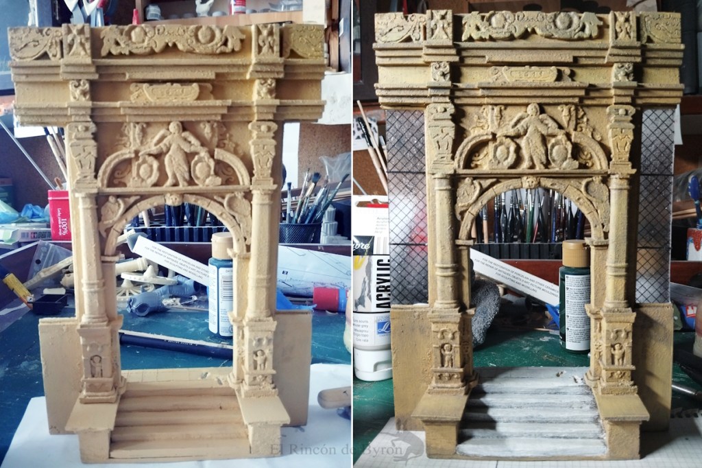 Los detalles en relieve más pequeños los hemos hecho con masilla de dos componentes, que nos permitía un grosor de pocos milímetros para definir mejor los detalles. Los motivos más grandes de la fachada son más o menos claros, volutas, vueltas, ángeles, etc., pero los más pequeños solo se han esbozado en el dibujo y variaban de un lado al otro de la puerta y en las cornisas superiores.