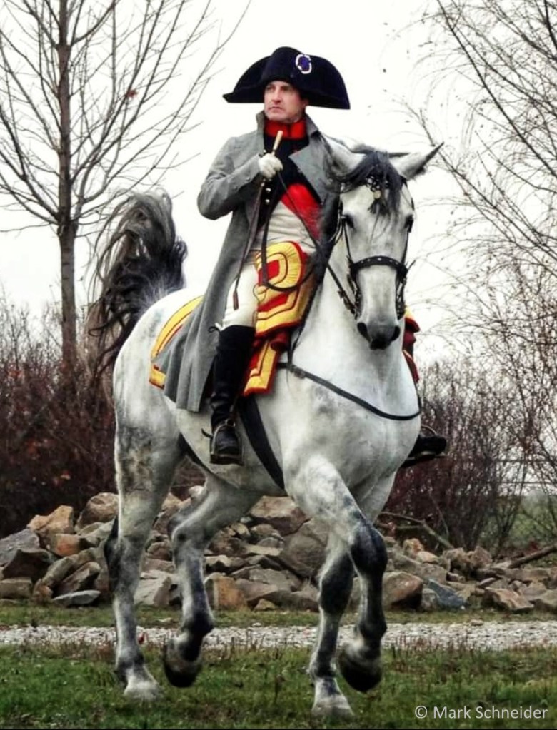 «Yes, I like that. I’ve always loved history, so I often say that I did not choose history, but rather history chose me. Because even if I was not doing this for a living, even if I was not working in museums and working with history, I would still be learning about history, reading books about history, discovering history, visiting sites. So, I never really was interested in theater, but because of my interest in history, and because I was given an opportunity to perform in this way, living history, that’s where I embraced it. I wouldn’t want to go to Hollywood, I wouldn’t want to go to Broadway. I don’t necessarily love the art of theater or acting, I appreciate it, but I found it is a wonderful way in which to tell the story, to interpret history. So, it was early on that I realized that this was a wonderful opportunity to be able to teach history. With the Napoleon character, I think from the very beginning, from my first event in Europe at Waterloo, I discovered that people were enjoying my presentation of Napoleon, and if I could continue to work on its authenticity, working on my presentations, working on everything from my horsemanship and equitation, to my speeches, to my mannerisms, the way I carry myself, then it will just get better and better. And that’s what I’ve always strove to do, because it’s not just me. It should not be about Mark Schneider. It should be about the people that I portray, most notably, in this case, Napoleon Bonaparte. He’s lived his life; he’s left his mark. It’s up to us to learn about what he had done. So thus, it’s my responsibility, my obligation, as a performer, as a historian, first and foremost, to tell the story as accurately as possible, so others might learn from the past. That’s right. And through these years, and these portraits, and these reenactments, one can understand why people, modern people, were fascinated by the figure of Napoleon. Yes. Well, I think he transcends the ages. I think the problems of Napoleon’s world, some of them still exist in the modern world. And the way he dealt with them, the way he overcame them or failed from them, are lessons from the past. Did not the great historian Santayana say, those who do not learn from history are condemned to repeat it? That’s right. Napoleon was a student of history. He read about the great captains of the past, of Alexander the Great, of Hannibal, of Julius Caesar, of Frederick the Great. And he applied those to the modern battlefield and modern situation that he encountered. So modern audiences, their fascination with Napoleon is that very few times, if ever in history, has someone like Napoleon come along in which he was a meteor. He embraced the revolution that propelled him forward and was able to do many positive things for the world. Yes, negative as well, but the reforms of the French law code, the creation of the Banque de France, the creation of the Légion d’Honneur, the creation of universities and schools, the spreading of the ideals of the Revolution of liberty, equality, and brotherhood, all of which would influence Europe, South America, and ultimately the world. These ideas were not new, but he was able to transport them through his intervention in Europe. So that’s why I think modern audiences find a fascination with him. It’s not just the uniforms. It’s not just the battles. It is the personalities in this Age of Revolution. There were certainly, there are many transitions in history, of course. The fall of the Roman Empire and the entrance into the Dark Ages, the Renaissance, the creation of the nation state. And I think the revolutions in America and then in France and then across Europe and the world were one of those transition points in which the world would never be the same as a result. So that’s why I really think modern audiences find such a fascination with him.»