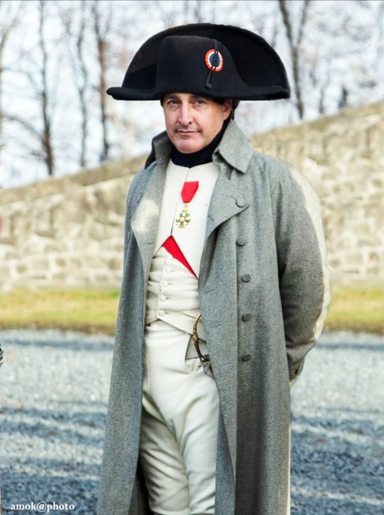 «Gran pregunta. Creo que los uniformes o disfraces, no nos gusta llamarlos disfraces, nos gusta llamarlos uniformes, son extremadamente importantes. Y la calidad de ellos utilizando los mismos materiales, teniendo el corte por un sastre adecuado para ajustarse al cuerpo como debe. Cuando sales al escenario o vas a una recreación o vas a una recreación a caballo, lo primero que el público y los recreadores van a ver eres a ti, tu disfraz y tu forma de comportarte. Así que eso ya va a decir mucho sobre quién eres. Entonces le doy mucho valor a los uniformes, al vestuario para la recreación. Y lleva tiempo. Se necesita dinero. Asume tu responsabilidad. Por ejemplo, si quiero seguir pareciendo el Napoleón de 1805 y no puedo hacerlo para siempre, pero ciertamente eso requiere que me mantenga en cierta forma en forma para lucir el papel de Napoleón, para retener esa energía. Tengo que practicar mi equitación casi todos los días. Entonces, cuando salgo al campo de batalla de recreación, miro en el lugar correcto como Napoleón a caballo. Entonces, si no tuviera un disfraz que se viera bien, se parecería más a un Carnaval que a un uniforme que usaría Napoleón. Entonces, mis uniformes, y tengo muchos de ellos, los que Napoleón habría tenido desde su uniforme de General de l’Armée de 1796 al 98 con el bordado dorado en el cuello y los puños hasta la transición al que estoy usando. ahora, el del Coronel de los Chasseurs à Cheval de la Garde Imperial, que en su sencillez de uniforme de coronel lo hacía destacar más que los mariscales del Imperio que lo rodeaban. Así es. Toda clase de bordados dorados y plumajes en sus sombreros. La simplicidad realmente lo hizo destacar. Así que sí, todo eso me parece muy, muy importante. Y trato de continuar no solo trabajando en los uniformes, sino también en mi físico, en los gestos, en la equitación, en el habla, en mis interacciones con los soldados. Todo eso es parte de la ecuación, en mi opinión, para lograr el éxito con la historia viva. Si sólo haces un aspecto, si tienes un uniforme perfecto, pero no sabes cómo comportarte con él, no va a funcionar. Si tienes un uniforme perfecto y te subes a un caballo y realmente no sabes montar, quedarás como un tonto. Si no sabes hablar en público o no recuerdas un discurso para dar a los soldados, no serás un Napoleón o un actor muy eficaz de ninguna manera.»