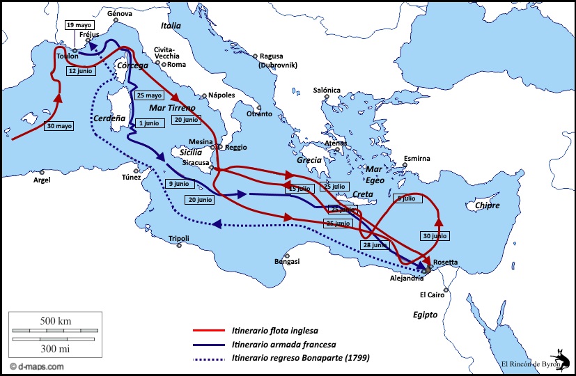 El almirante Brueys, comandante naval francés, evadió hábilmente el escuadrón británico enviado para interceptarlo (comandado nada menos que por Horacio Nelson) y seis semanas después, el 30 de junio, la flota ancló frente a Alejandría.