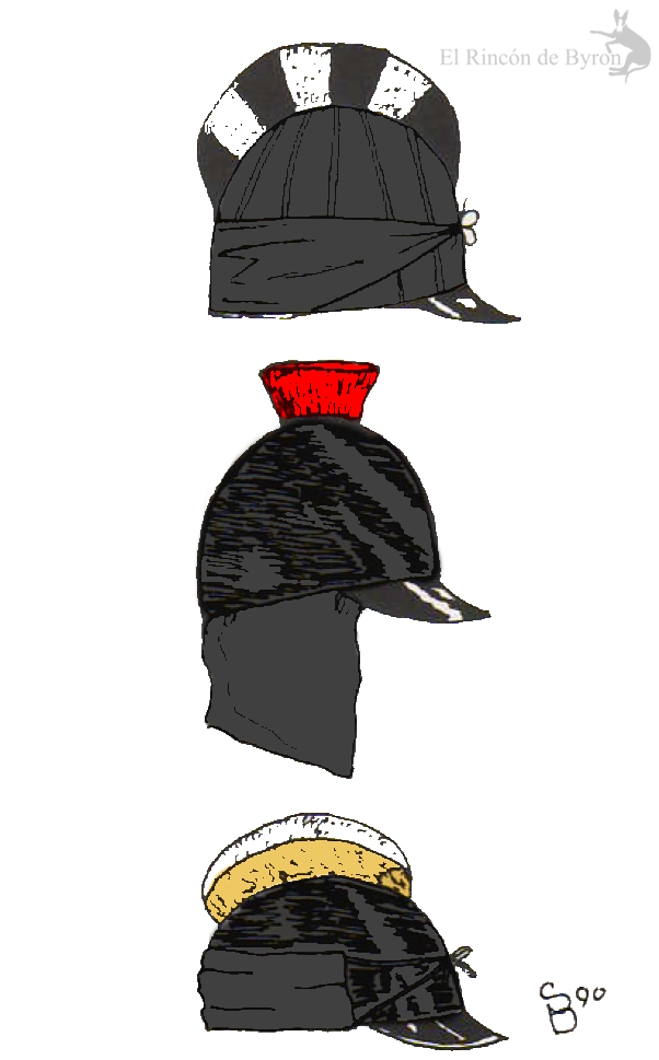 Ilustración I. Ejemplos del casco modelo 1798. Cuero negro con cubrecuello de cuero o algodón y cimera de lana de colores (ver Tabla II). Extraído de Marrion y Fosten.