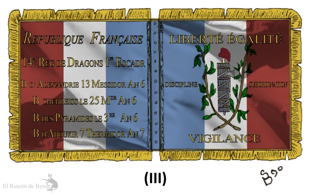 Pour une raison quelconque, les couleurs de l’escadron du modèle de l’Armée de l’Orient délivrées au 14e Dragons en 1799 et au Régiment de Dromadaries la même année étaient différentes, à savoir :