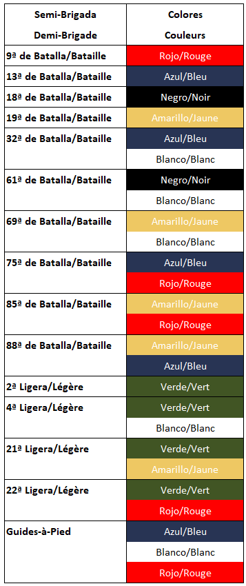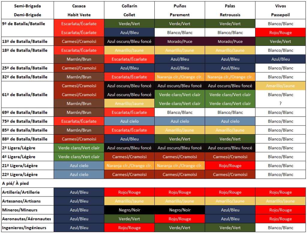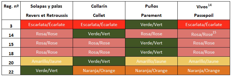 Nota: En los regimientos de dragones el color de frente del collarín, puños, etc. eran de color verde oscuro y viceversa, las hombreras siempre eran de color verde oscuro y con vivos. El 22º de Cazadores tenía hombreras de color verde oscuro con vivos de color naranja y vivos verdes solo en el cuello; las solapas pueden haber sido de color verde con vivos de color naranja.