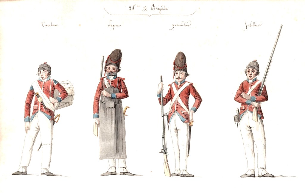 *Yves Martin nous donne une série de précisions sur FB à propos des uniformes de cette époque : «Les uniformes d’infanterie que vous montrez n’ont PAS été adoptés fin 1798, mais fin 1799 et, en réalité, ils n’ont pas été utilisés jusqu’au début des années 1800.»