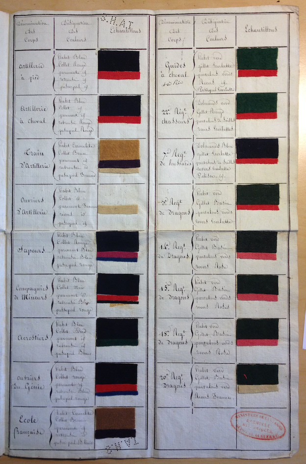 Sur les uniformes de la fin 1798, vous pouvez consulter mes propres posts FB publiés récemment où j’ai posté des «interprétations» des différents textes de Rousselot – ce sont des manteaux bleus assez simples avec un pantalon / guêtre-pantalon blanc pour la ligne et tout bleu pour la lumière. Le «casquette» a été adopté à la fin de 1798, mais n’a pas été très populaire – le chapeau est resté très utilisé comme le montrent les aquarelles contemporaines jusqu’en 1800-1801. De plus, les uniformes multicolores variaient beaucoup dans le sens où une couleur décrite comme par exemple « rouge » pouvait varier en teinte en fonction de l’unité considérée compte tenu de l’approvisionnement qu’elle recevait. Finalement les couleurs ont changé jusqu’au dernier moment et même les textes dont nous disposons ne reflètent pas l’attribution définitive que l’on retrouve sur un document conservé dans les archives de guerre françaises.«