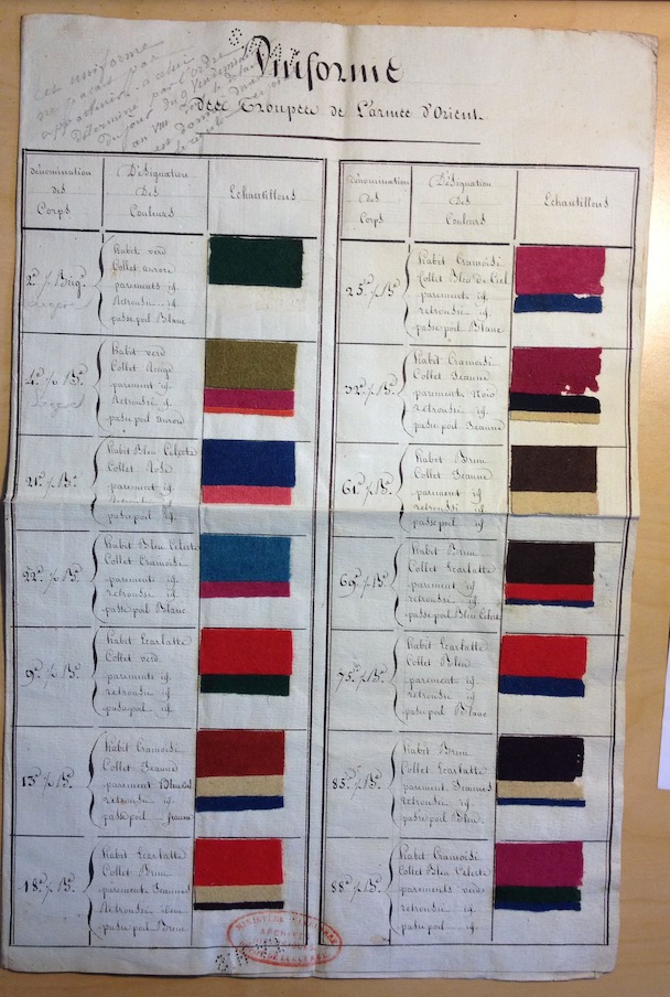 Derecha. Uniforme de las tropas del Ejército de Oriente. Documento enviado por Daure en 1800 al ministro de la guerra. (Imagen cortesía de Yves Martin)