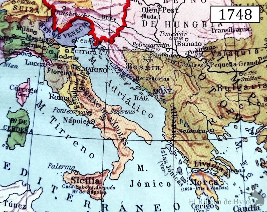 Los Balcanes en 1748, con los territorios dominados por el Imperio Otomano y los pequeños enclaves costeros e islas de la República de Venecia.