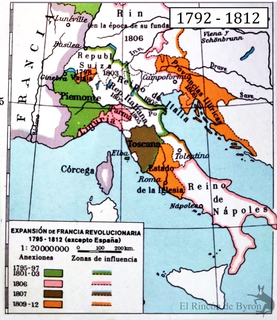 La expansión de la Francia Revolucionaria, Consular y luego Imperial, en las tierras de Suiza, Italia, Piemonte y los Balcanes.