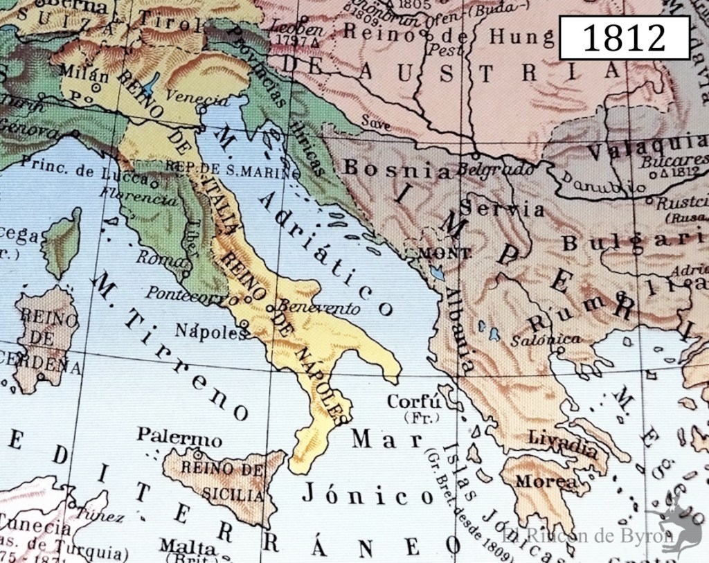 Los Balcanes en 1812, con las provincias Ilirias como zona de «contención» entre el imperio austriaco y el Reino de Italia, cerrándole el paso al mar del primero.