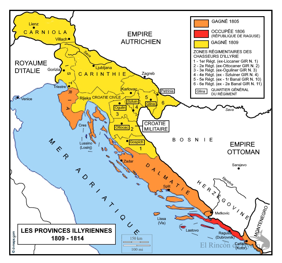 Après la brillante victoire napoléonienne à la bataille d’Austerlitz en 1805, les territoires occupés de la péninsule italienne furent rebaptisés Royaume d’Italie avec pour capitale la ville de Milan. Cette victoire donna également à Napoléon la clé des Balkans et représenta un changement radical dans l’organisation et le gouvernement ultérieurs des soi-disant « Provinces Illyriennes ». Bien que le royaume d’Italie ait été fondé en 1805, conséquence de la fusion de deux territoires italiens, la République Cisalpine et la République Transpadane, c’est-à-dire Turin et Milan, l’année 1809 est fixée comme date de création des Provinces Illyriennes, après le traité de Schönbrunn, par lequel Napoléon annexa aussi Trieste et la Dalmatie, qui appartenaient à l’Empire autrichien, ainsi que Raguse (Dubrovnik), que l’armée napoléonienne annexa en 1808.